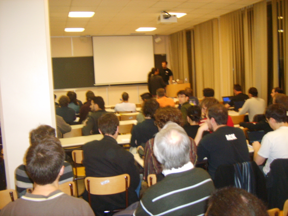 Étiquette portant notre nom fièrement collée sur le torse et programme dans la poche, nous nous installons dans la salle, où nous retrouvons Lucas NUSSBAUM, notre ancien prof d'ASRALL (enfin, pour les trois quarts de notre groupe).